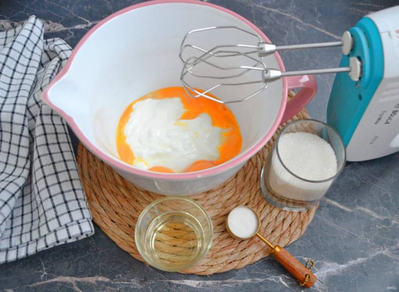 Желтки добавьте к йогурту, туда же добавьте растительное масло, сахар, ванильный сахар. Смешайте до однородности и растворения сахара.