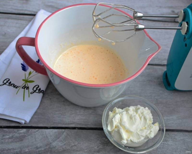 Добавьте в миску сметану и вмешайте ее миксером.