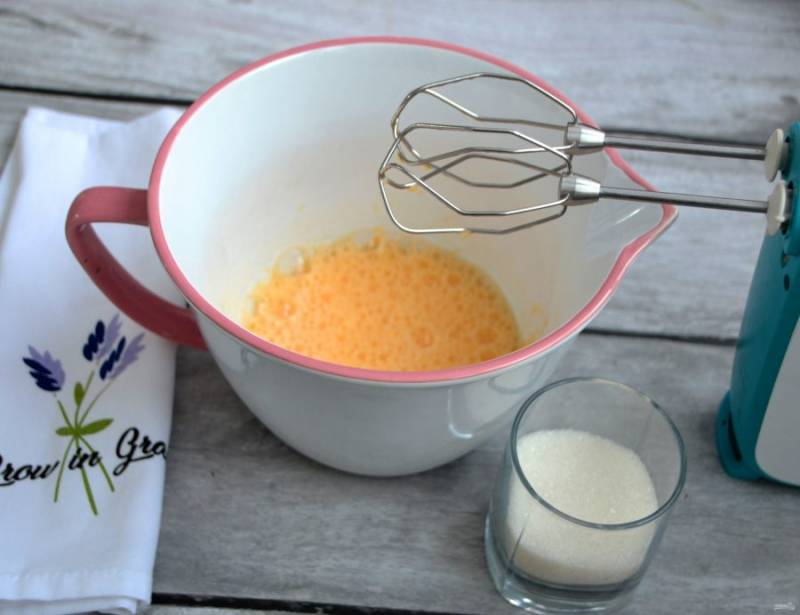 Продолжайте взбивать, постепенно всыпая сахар на средних оборотах миксера в пышную пену.