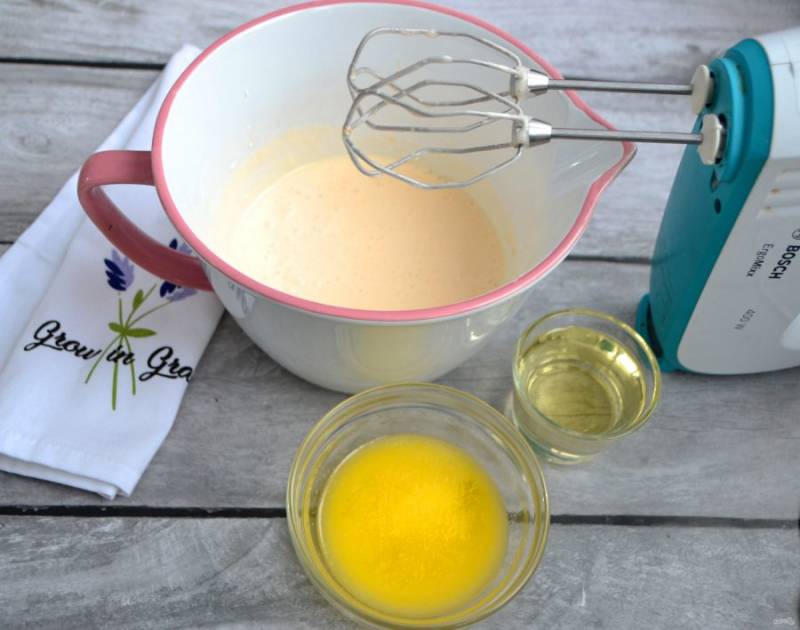 Добавьте растопленное сливочное масло и растительное масло. Можно использовать только сливочное или только растительное, либо их смесь, как в данном рецепте.
