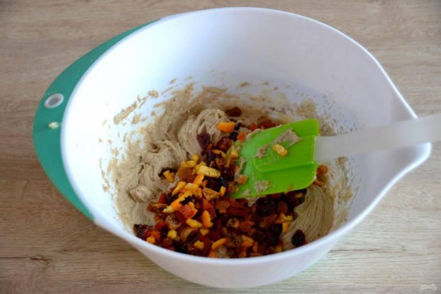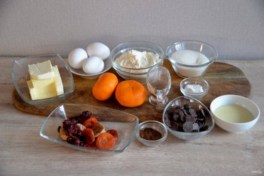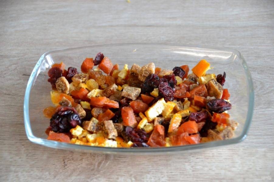 Сухофрукты порежьте на небольшие кусочки, можно добавить кожуру мандаринов, залейте 2 ст. ложками коньяка.