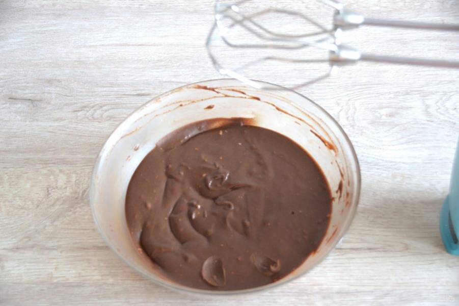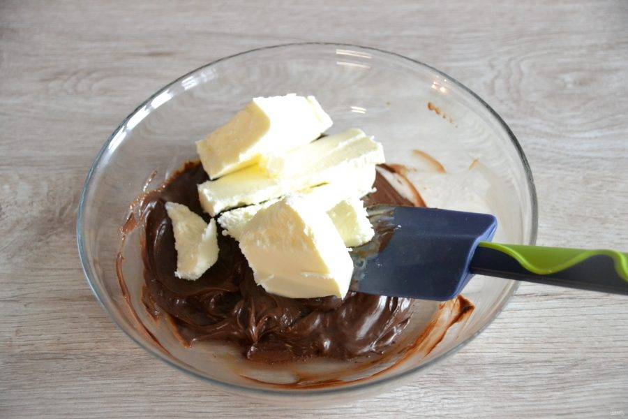 Вмешайте в шоколадную смесь сливочное масло, охладите под пленкой.