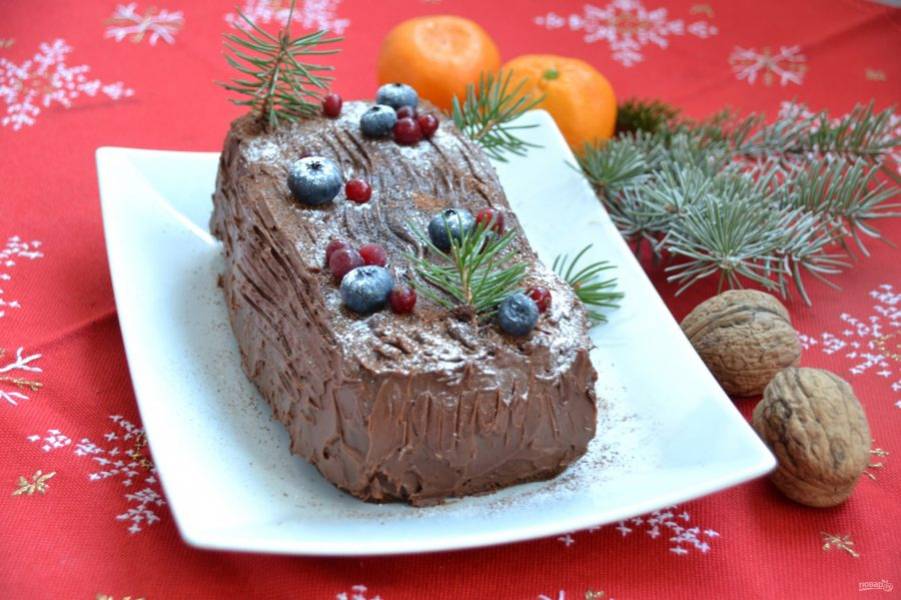 Нанесите шоколадный ганаш на кекс, создайте неровности, имитирующие кору дерева, это можно сделать с помощью вилки. Присыпьте слегка местами какао-порошком, сахарной пудрой, воткните небольшие еловые веточки или веточка розмарина, украсьте ягодами. Шикарный праздничный кекс "Полено" никого не оставит равнодушным! Приятного аппетита!