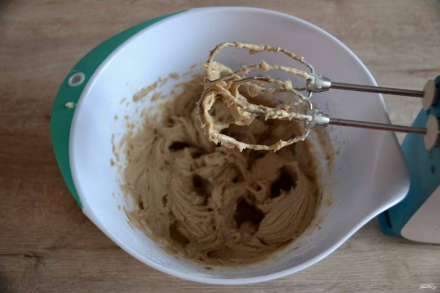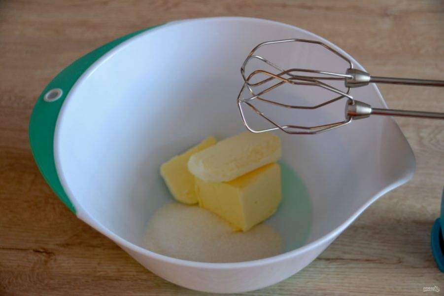 Взбейте 170 грамм мягкого сливочного масла и 125 грамм сахара.
