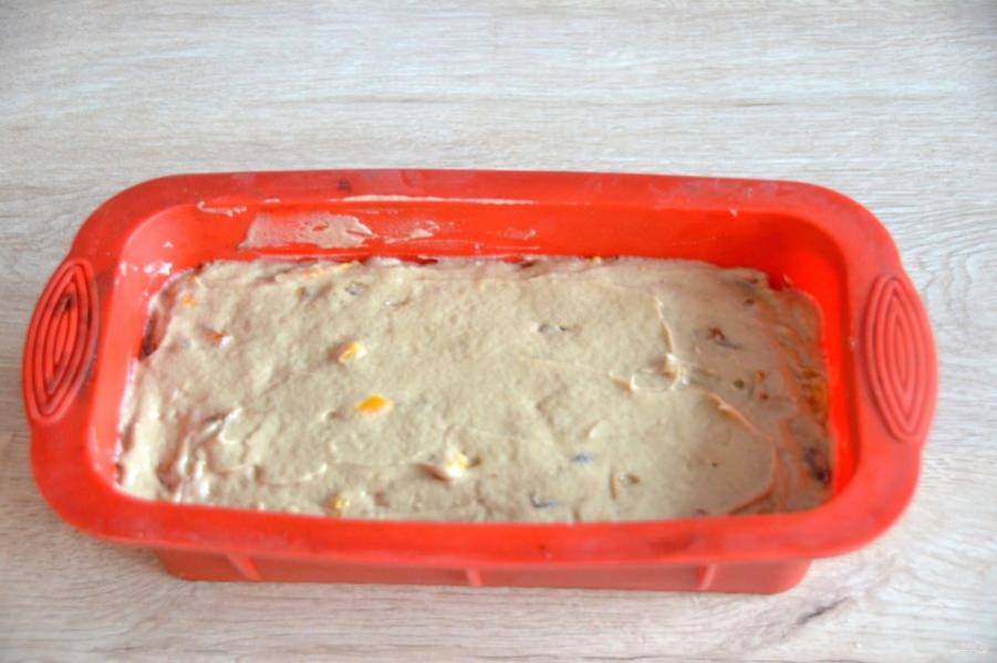 Последним слоем будет тесто. Выпекайте кекс в духовке при температуре 180 градусов 40-45 минут, готовность проверяйте деревянной шпажкой.