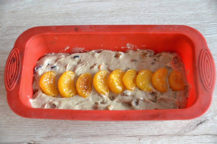 Выложите 1/3 теста в форму для запекания, выложите ряд мандариновых долек, слой теста, слой мандаринов.