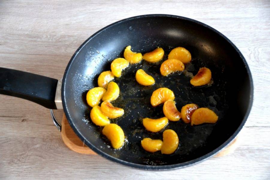 В сковороду выложите 10-15 грамм сливочного масла и чайную ложку сахара, обжарьте (карамелизируйте) мандарины, уберите их на тарелку.