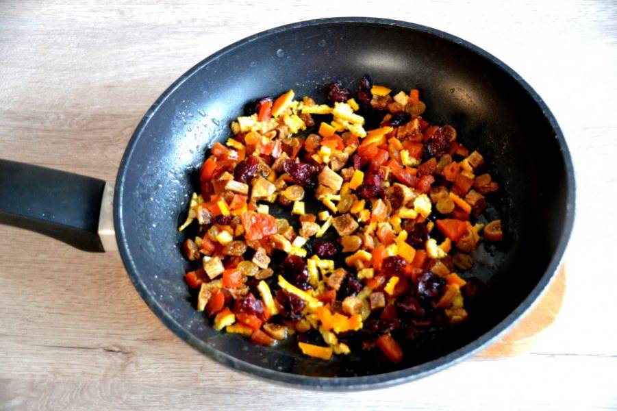В эту же сковороду всыпьте сухофрукты и слегка обжарьте до испарения паров коньяка.