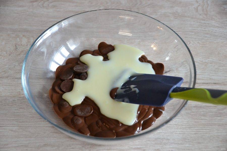 Растопите шоколад на водяной бане или в микроволновой печи, добавьте в него сгущенное молоко, смешайте.