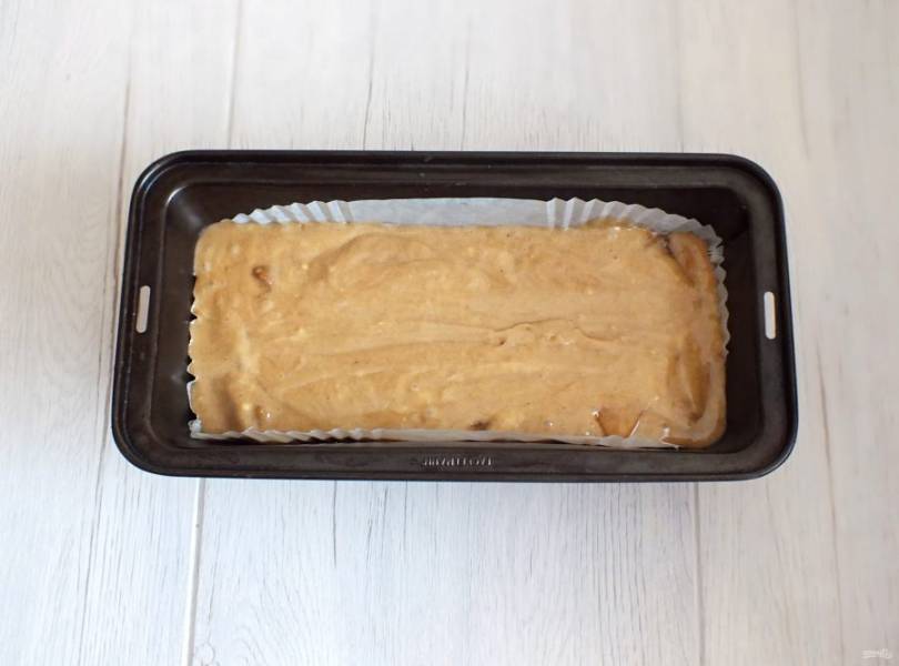 Форму для выпечки обильно смажьте сливочным маслом или застелите бумагой. Перелейте в нее тесто. Лопаткой посередине теста сделайте глубокую бороздку. Форму с тестом поставьте в разогретую до 180 градусов духовку на 25 минут, после убавьте до 160 градусов и выпекайте еще 15 минут.