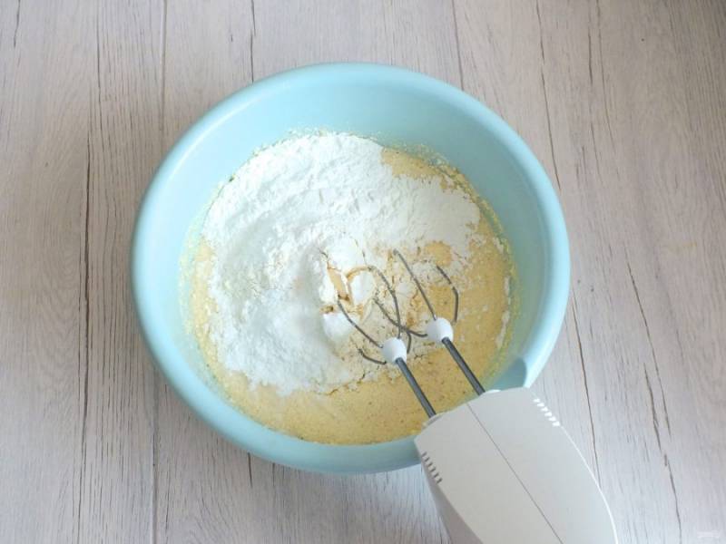 Добавьте муку, крахмал, разрыхлитель.