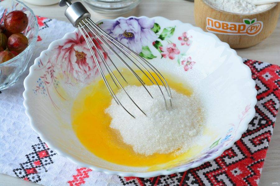 Перемешайте тесто с крыжовником. Ягоды заранее промойте, просушите и удалите хвостики.