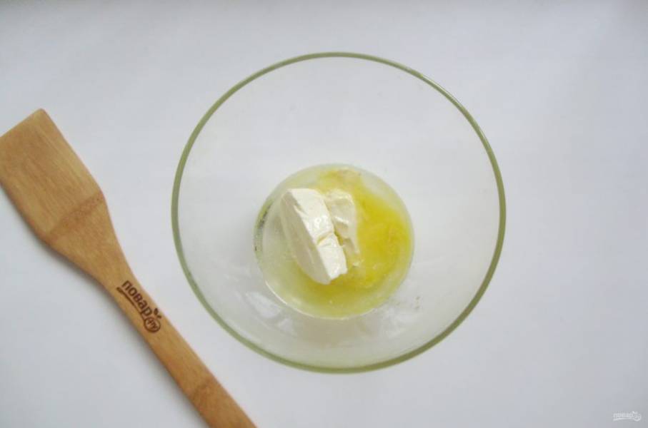 В миску выложите мягкое сливочное масло и налейте подсолнечное.