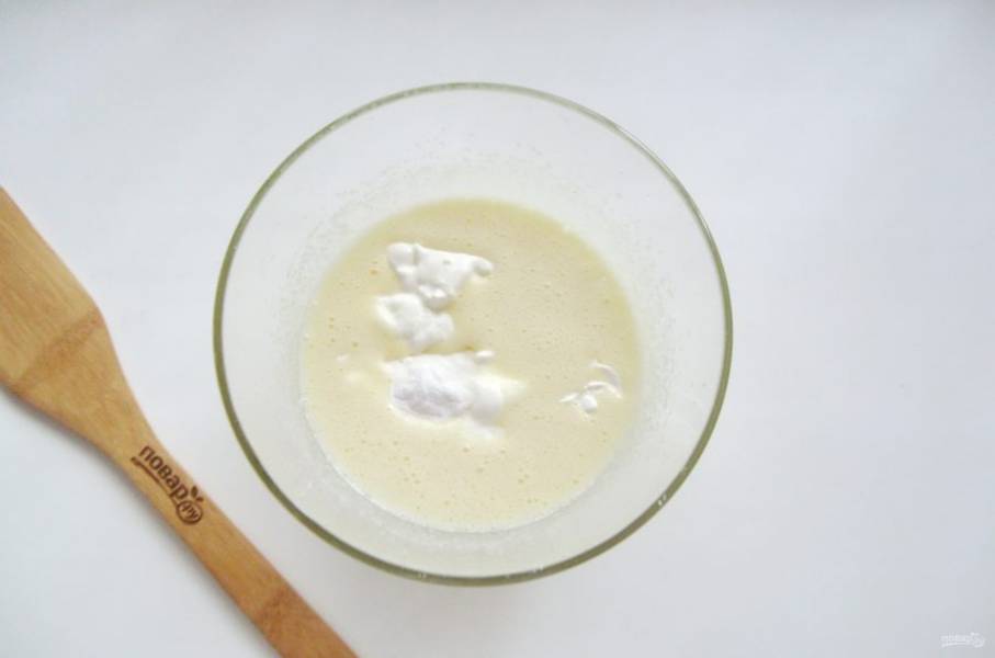 Хорошо перемешайте венчиком или миксером подсолнечное масло, сливочное, сахар и яйца. Добавьте сметану и соду.