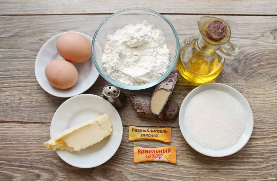 Подготовьте все необходимые ингредиенты для приготовления кекса с марципаном. У меня марципановый батончик в шоколаде, но это даже лучше. Сливочное масло достаньте заранее, чтобы оно стало мягким.