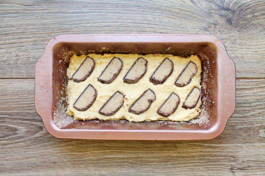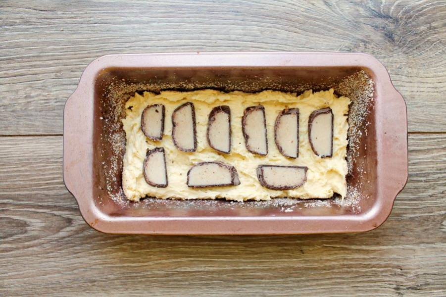 Форму для кекса 12 на 22 см. смажьте растительным маслом и обсыпьте панировочными сухарями. Выложите половину теста и разровняйте. Марципан нарежьте на кусочки и разложите половину поверх теста.