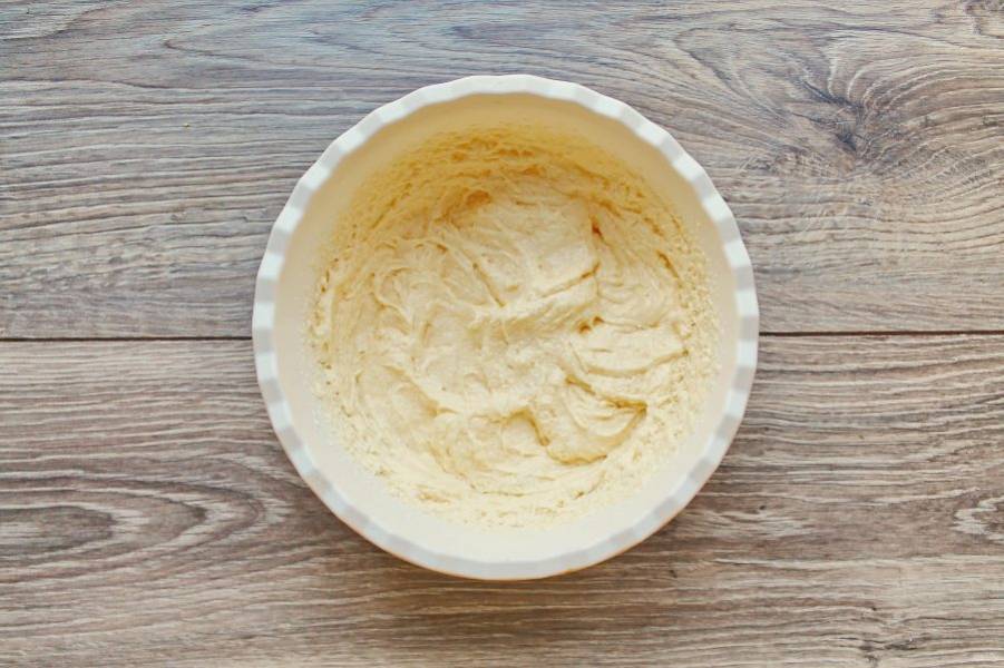 Муку соедините с разрыхлителем и просейте в миску со взбитой массой. Перемешайте все до однородного и мягкого теста.