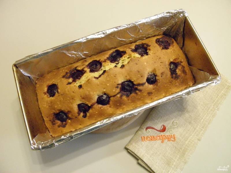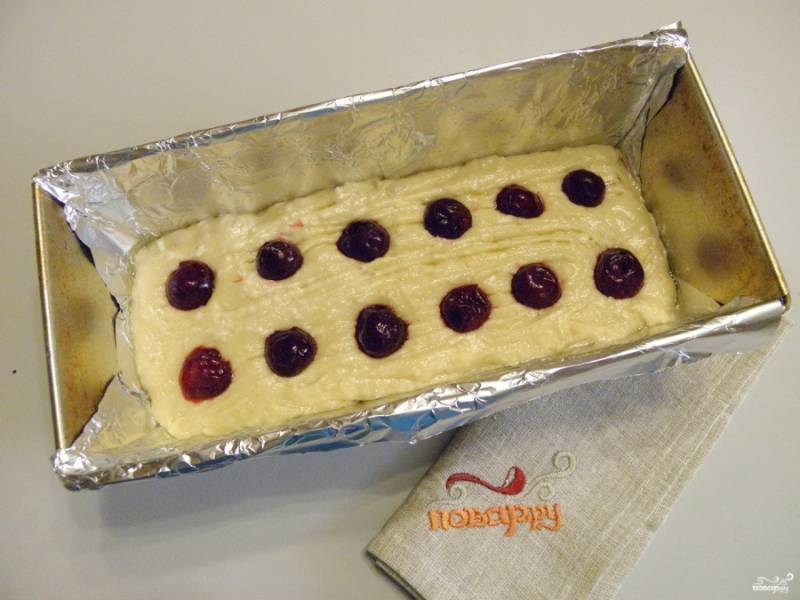 6. Выложите сверху вишни, чуть вдавливая их. Количество вишен можно увеличивать согласно вашим желаниям. Отправьте кекс с вишней в духовку на 40 минут, температура духовки — 180 градусов.
