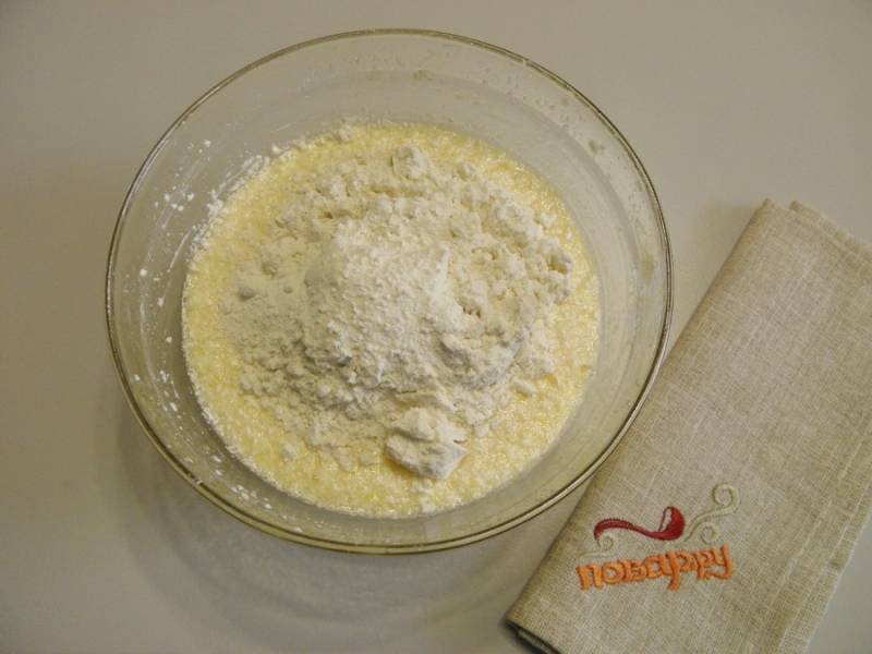 3. Добавьте муку, смешанную с разрыхлителем. Перемешайте тесто.