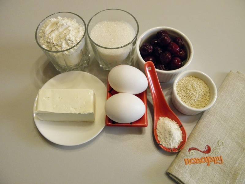 1. Подготовьте продукты для кекса. Маргарин оставьте на некоторое время, чтобы он стал комнатной температуры, топить его не нужно. Из вишен удалите косточки.