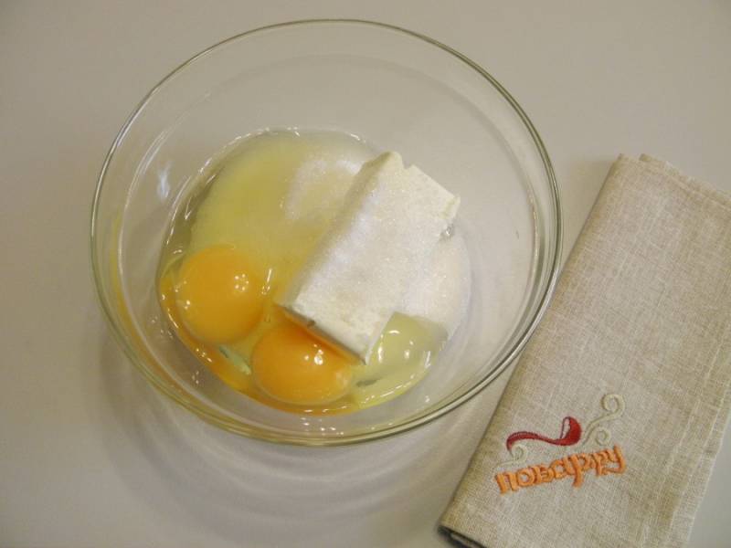 2. Смешайте маргарин с сахаром, ванильным сахаром и яйцами. Воспользуйтесь для этого венчиком или миксером.