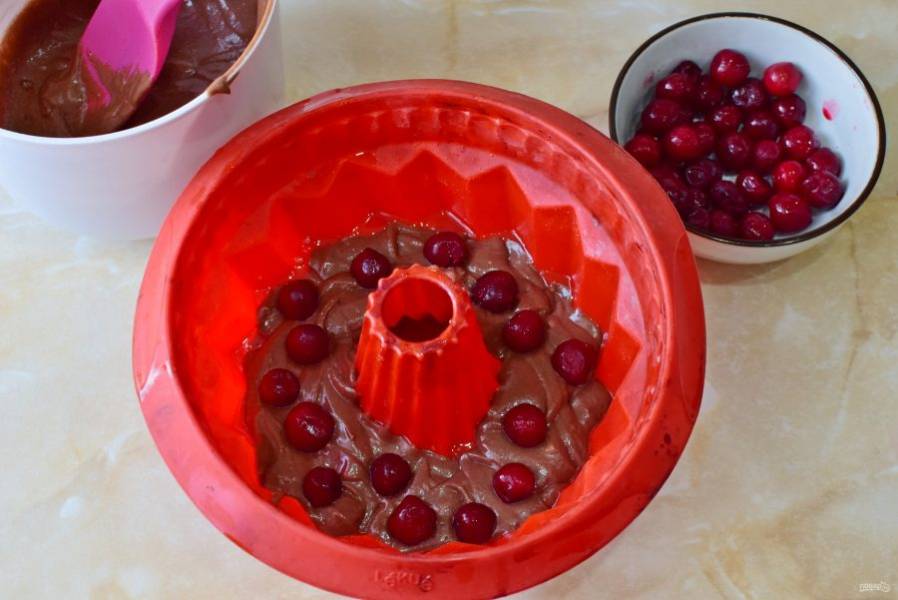 Для выпечки можно взять форму из силикона или стекла. Смажьте её растительным маслом и выложите половину теста. Добавьте вишню.
