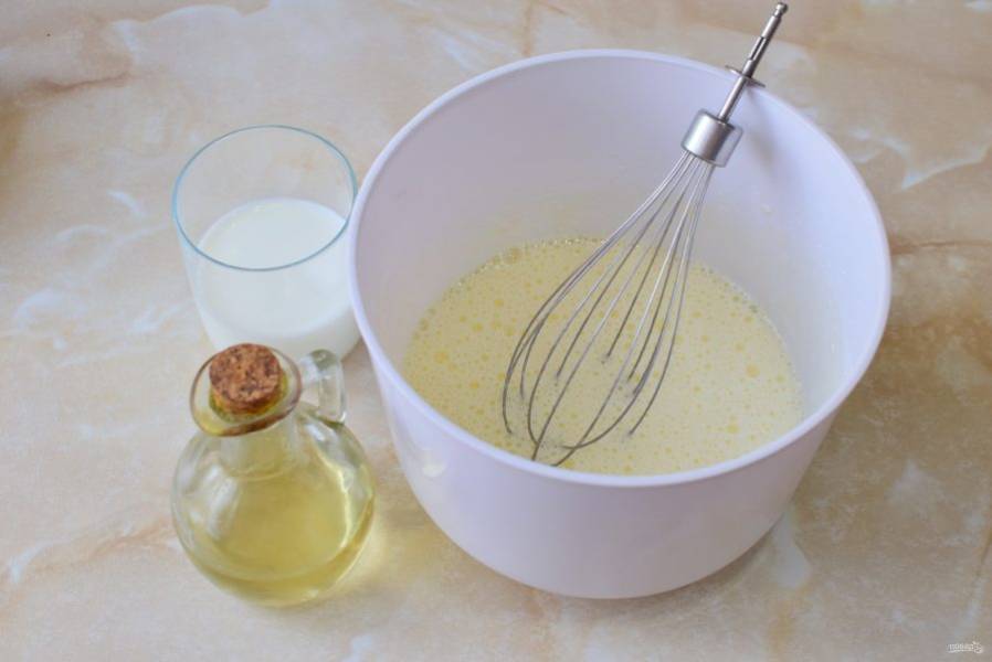 К взбитым яйцам вмешайте молоко и растительное масло.