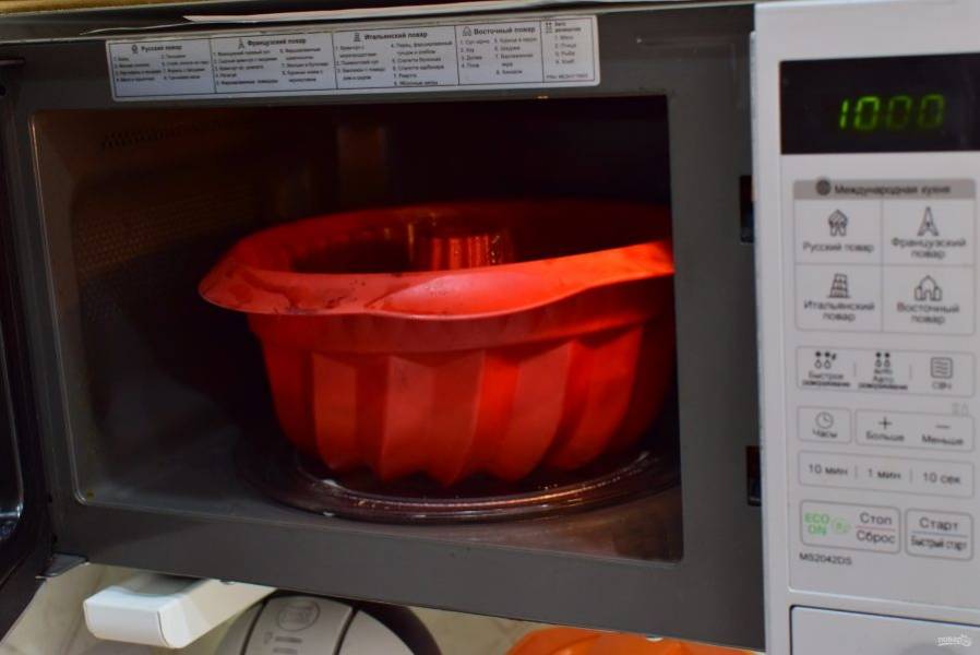 Поставьте кекс в микроволновку и включите на 10 минут. Спустя указанное время проверьте кекс на готовность. Проткните его деревянной шпажкой и вытащите. Она должна быть сухая. При необходимости добавляйте время еще по 1 минуте. У меня ушло 12 минут.