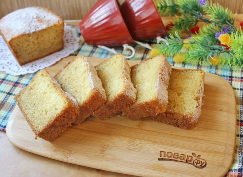 Кекс "Серебряный ярлык" по ГОСТу готов. Перед подачей его можно посыпать сахарной пудрой, нарезать и подавать к столу.