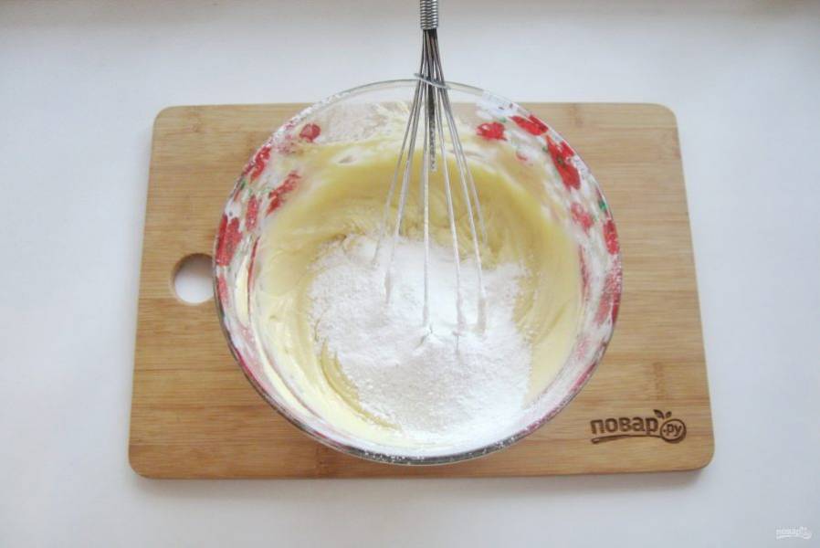 В приготовленную смесь добавьте просеянную муку. Это очень важно.