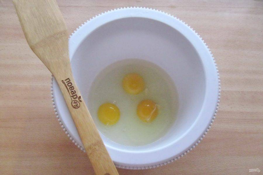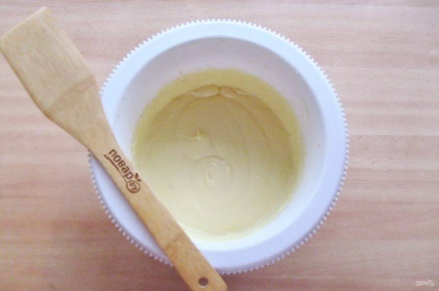 Яйца с сахаром взбейте миксером или венчиком до пышной консистенции. Добавьте растопленное сливочное масло и еще немного взбейте.