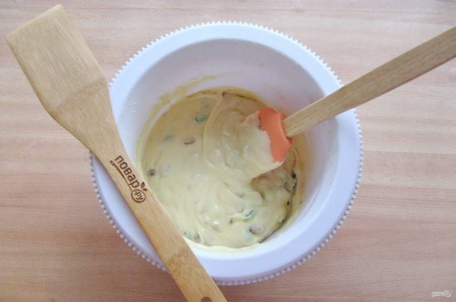 Изюм помойте. Цукаты мелко нарежьте, у меня киви. Добавьте в тесто.