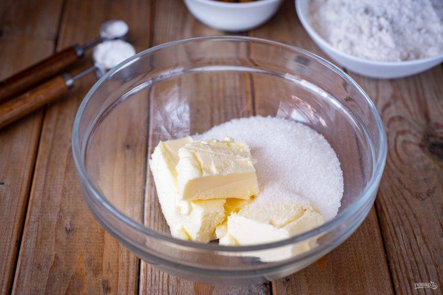 В просторную миску выложите мягкое сливочное масло, нарезанное для удобства кусочками. Добавьте сахар.