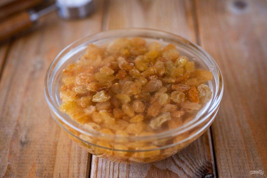 Изюм промойте, выложите в мисочку, залейте кипятком на 15 минут.