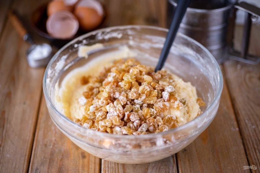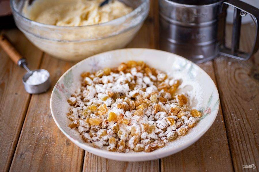 С изюма слейте воду, переложите его в мисочку, присыпьте мукой и перемешайте.