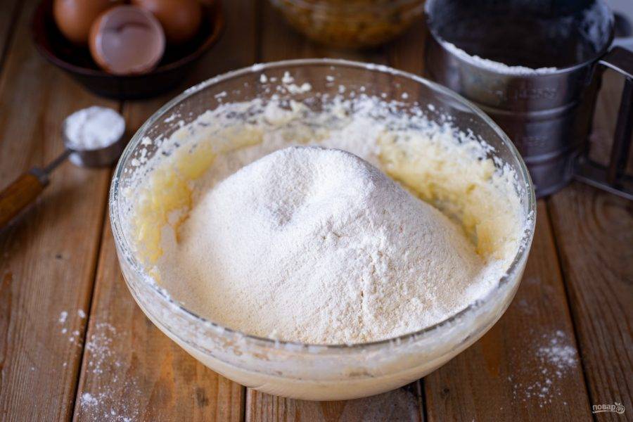 Просейте к этой массе муку с разрыхлителем. Добавьте ванильный сахар.