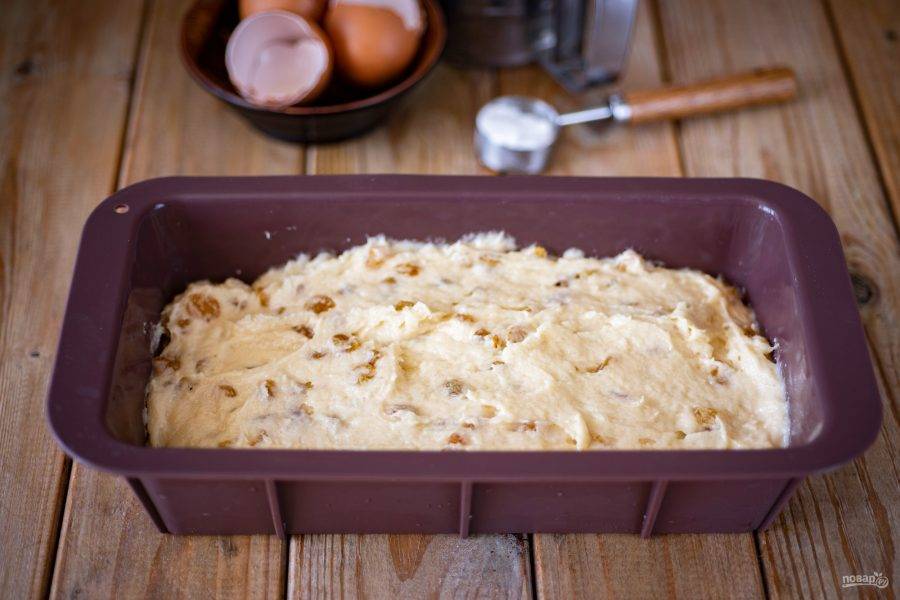 В форму для кекса выложите тесто, разравнивая его лопаткой. У меня форма силиконовая, поэтому я ее ни чем не смазываю. Отправьте заполненную форму в уже заранее разогретую до 180 градусов духовку и выпекайте кекс примерно 40-45 минут.