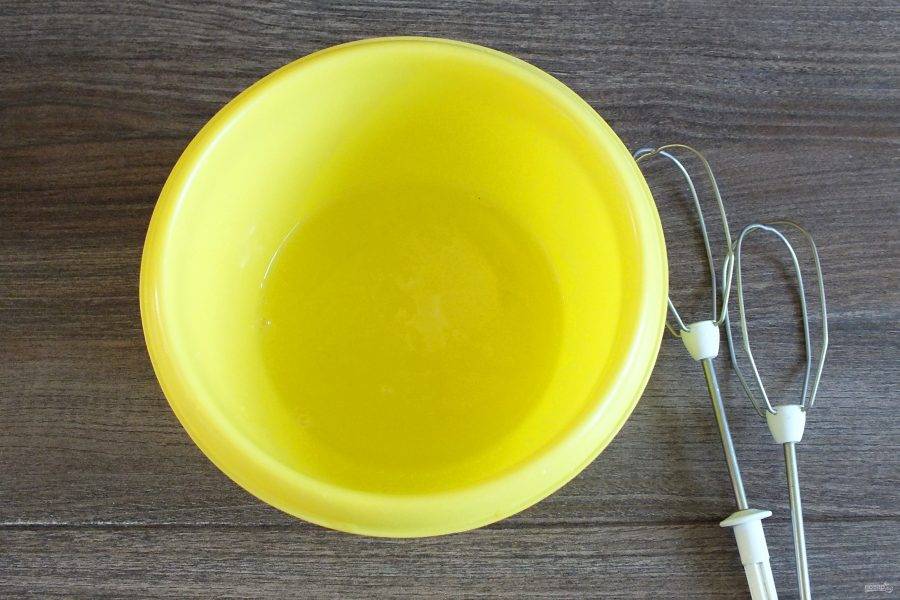 К желткам добавьте сахар. Взбейте в пышную массу.