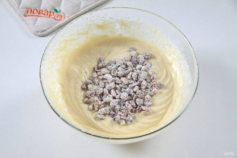 6. Взбейте все еще раз до однородного состояния. Добавьте промытый и просушенный изюм. Изюм я предварительно обваливаю в муке.