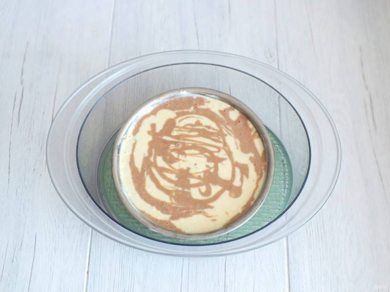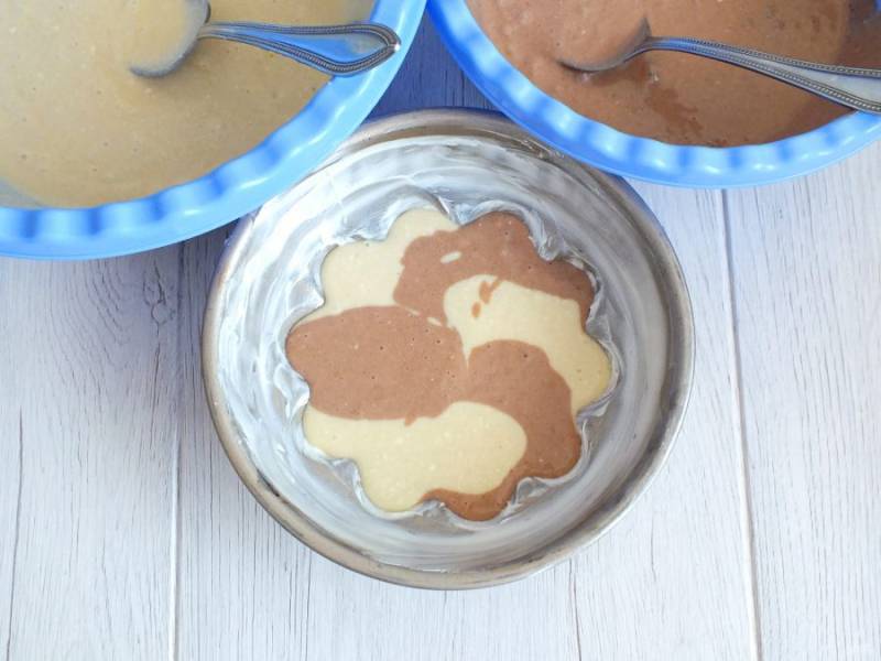 Возьмите небольшую форму для выпечки. Это может быть стеклянная или керамическая форма. Смажьте обильно сливочным маслом. В хаотичном порядке наливайте подготовленное тесто, чередуя обычное с шоколадным.