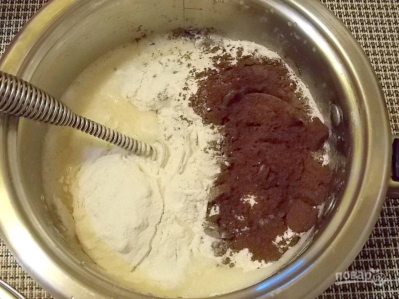 Добавьте смешанную пшеничную муку с разрыхлителем и черемуховую муку. Перемешайте до однородной массы.