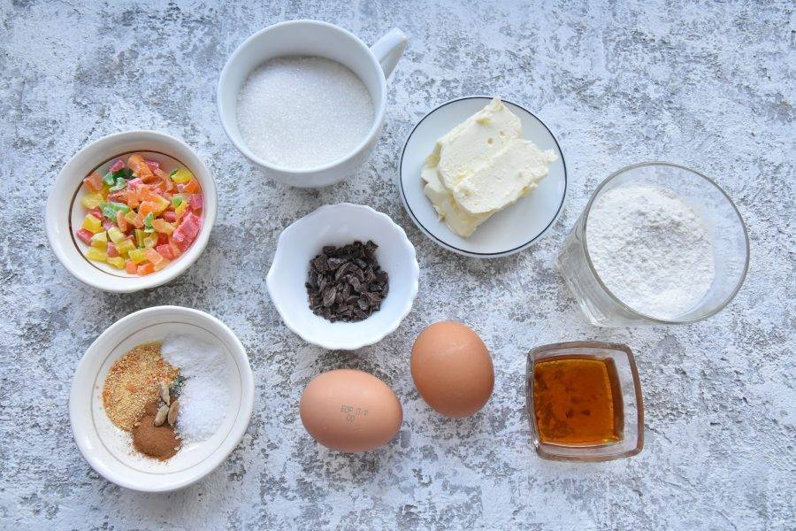 Подготовьте продукты для приготовления пасхальных кексов. Масло заранее достаньте из холодильника. Цукаты нарежьте и залейте амаретто. Шоколад измельчите ножом.