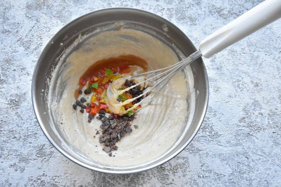 В готовое тесто добавьте рубленый шоколад и кусочки цукатов вместе с остатками амаретто.