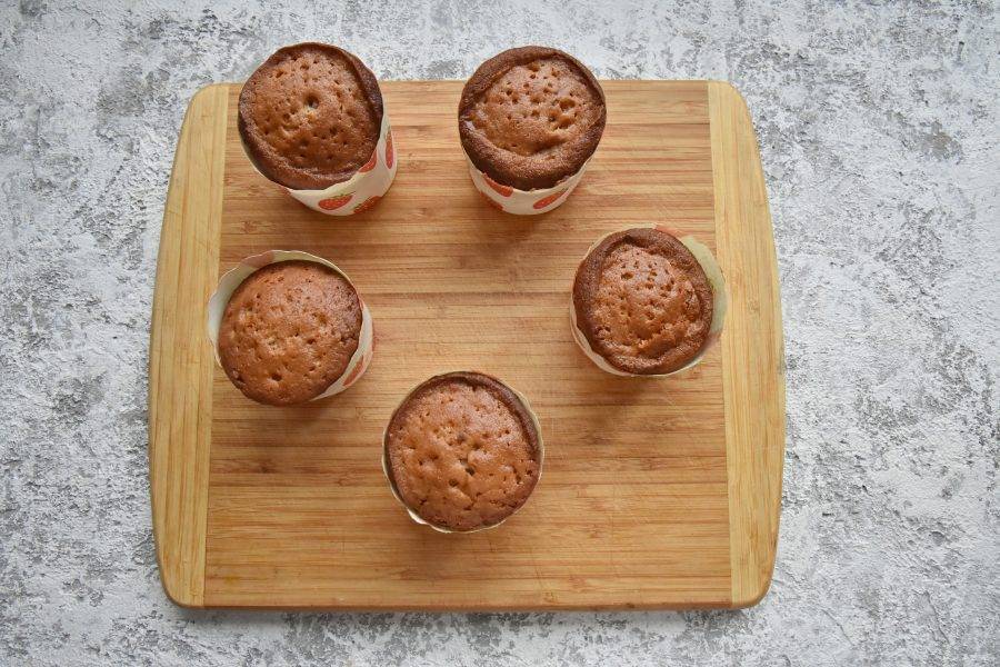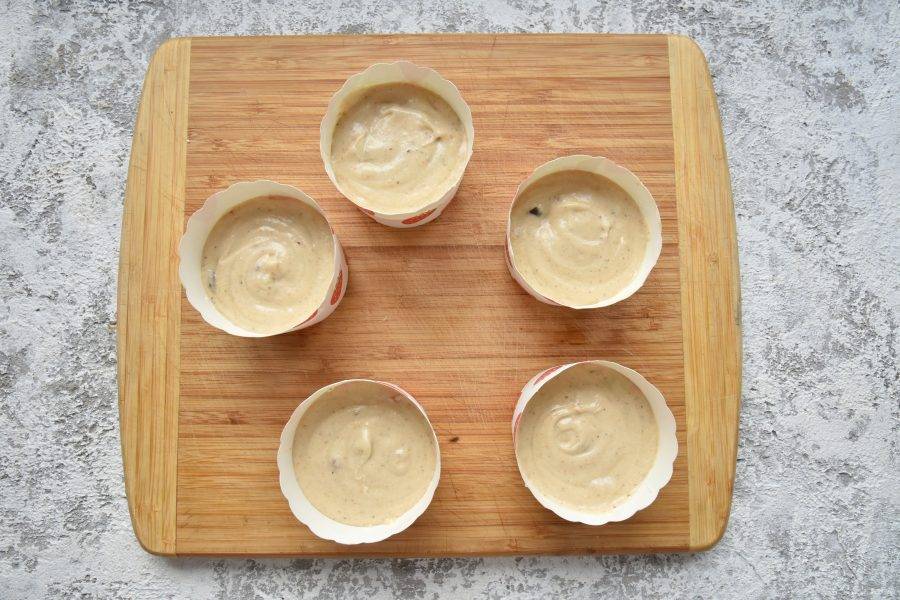 Подготовьте формы для выпечки. Заполните их на 3/4 объема. Из данного количества теста получается пять небольших кексов, весом по 150-170 граммов.