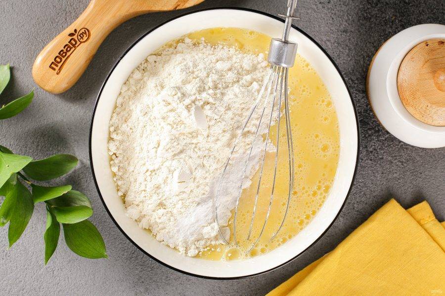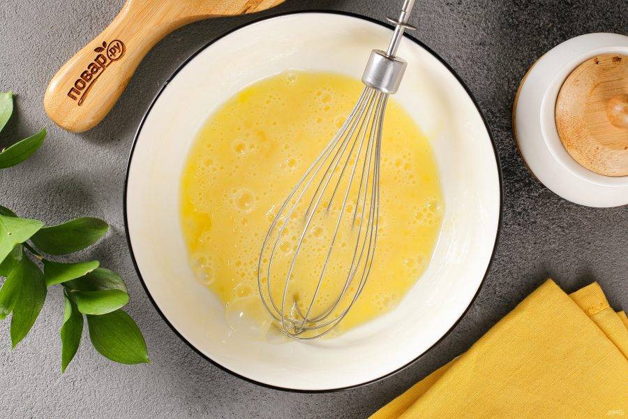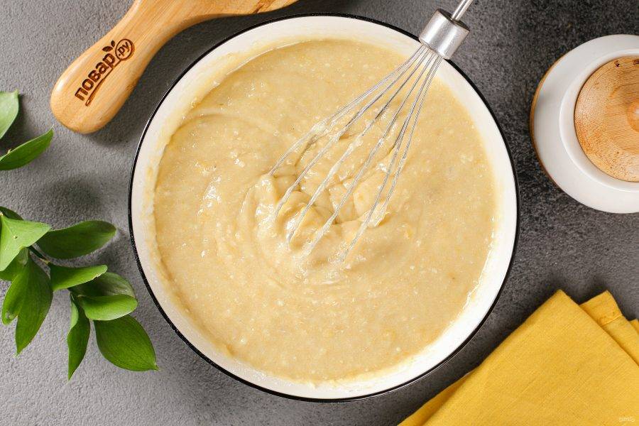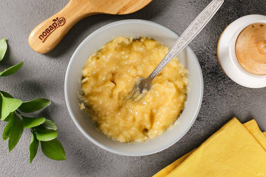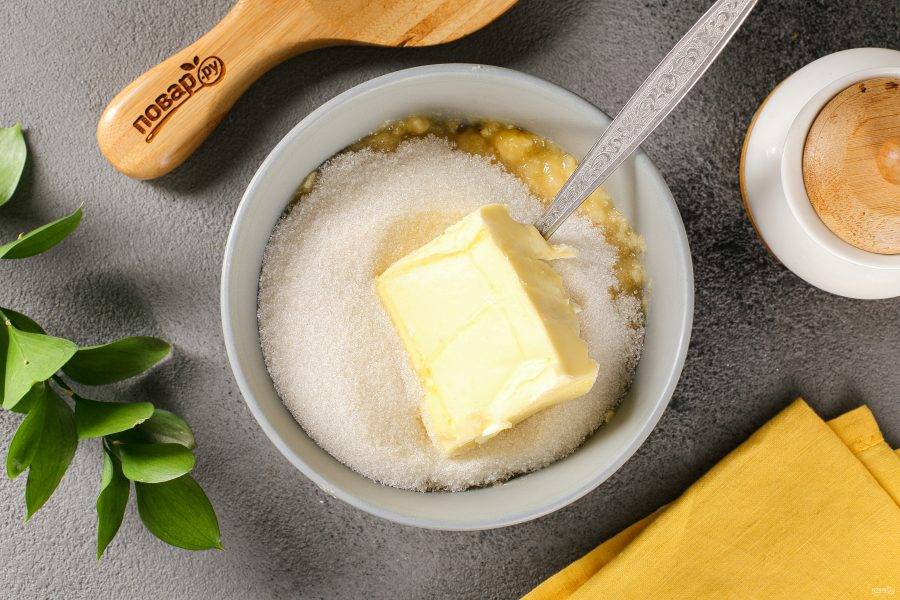 Добавьте сахар и масло. Перетрите всё вместе при помощи вилки до однородности.