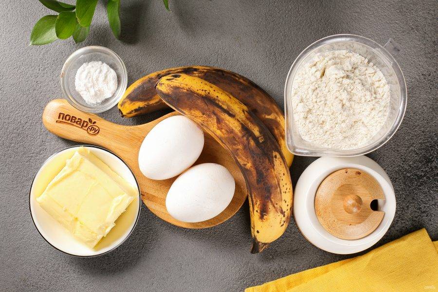 Подготовьте все ингредиенты. Бананы выбирайте спелые, с тёмной кожей и пятнышками. Масло заранее размягчите при комнатной температуре.