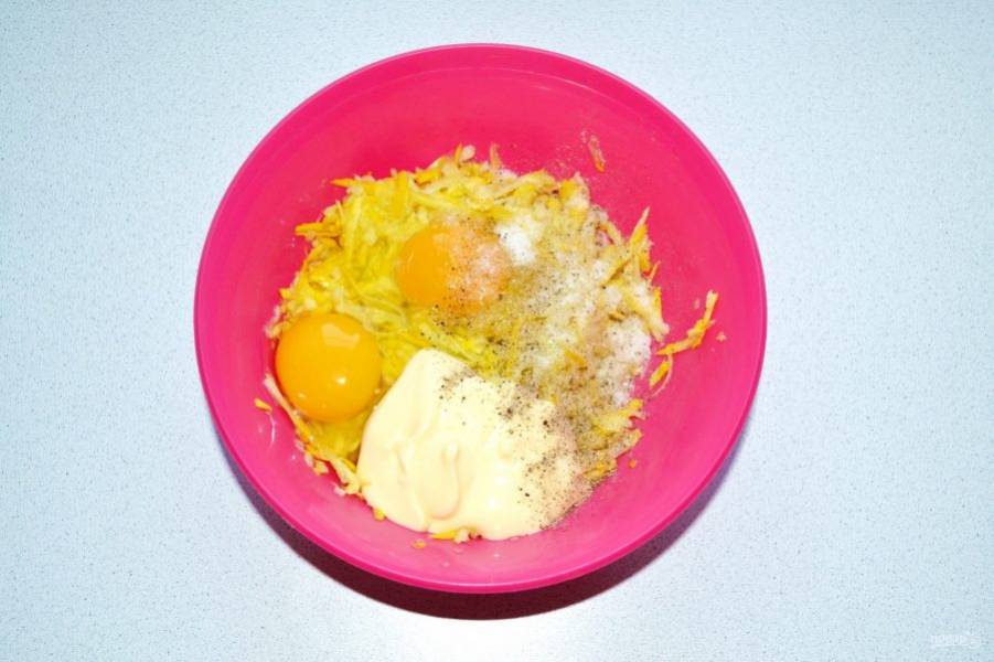 Добавьте соль, перец и немного майонеза или сметаны. Тщательно перемешайте.