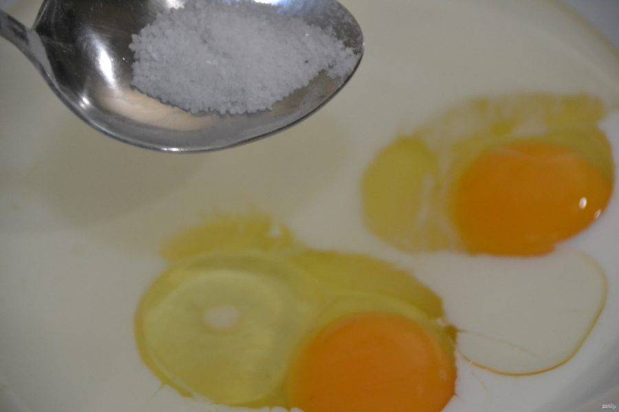 Возьмите один яичный белок, добавьте к нему щепотку соли.