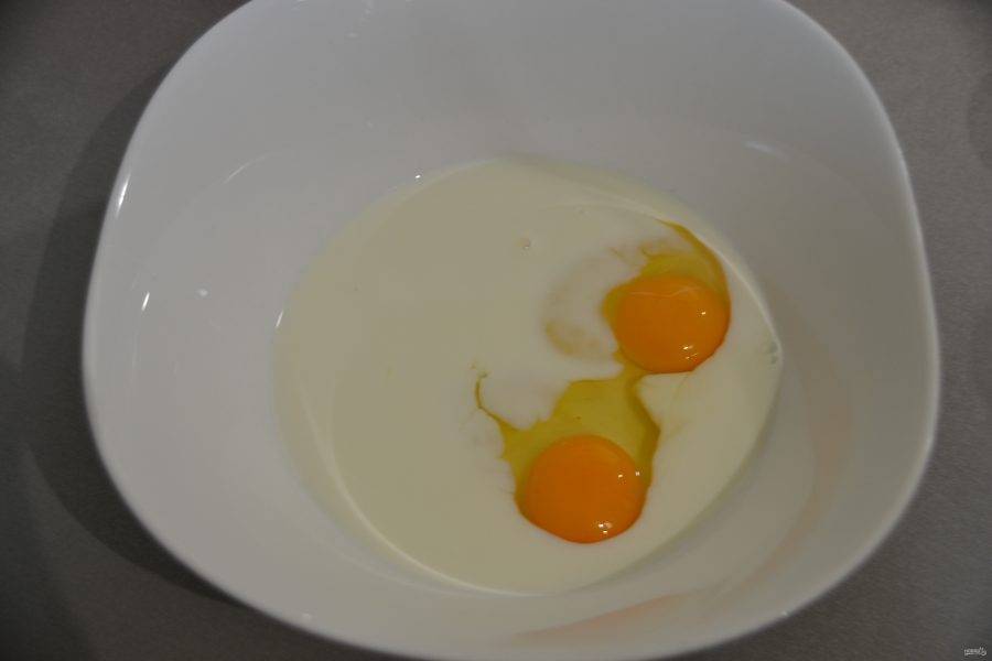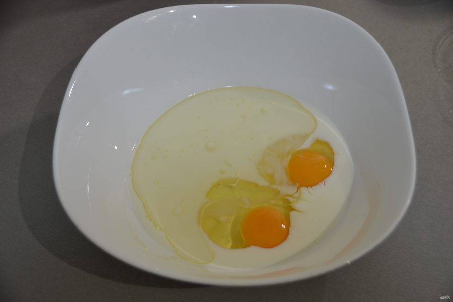 В отдельную посуду вбейте два яйца, влейте молоко.