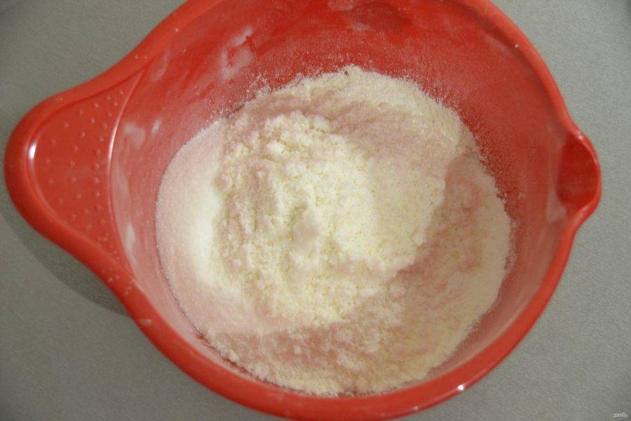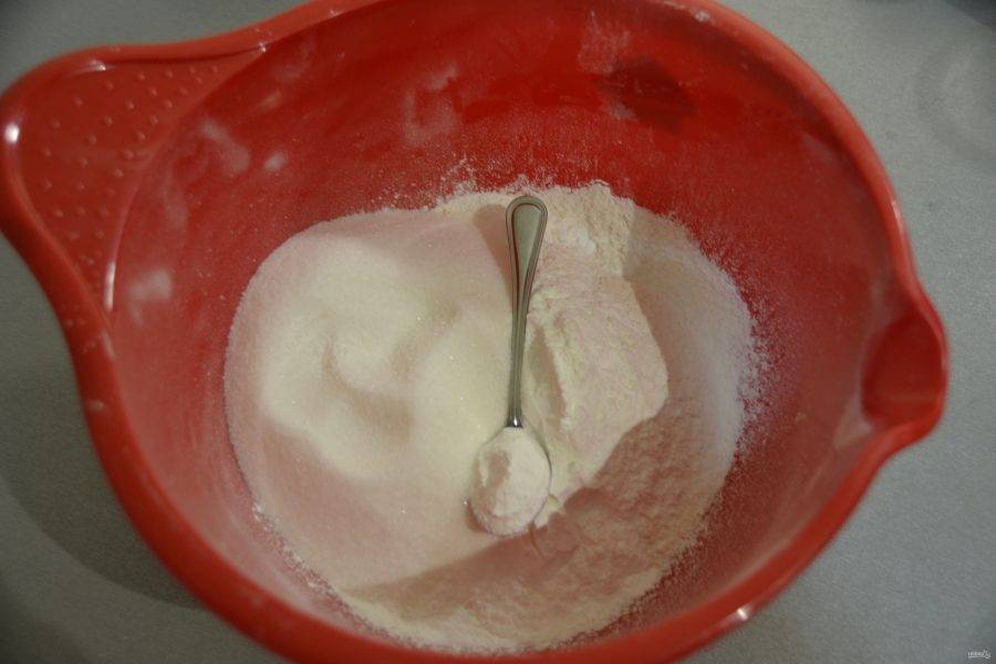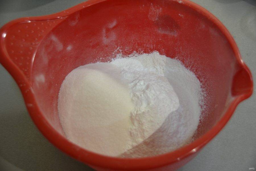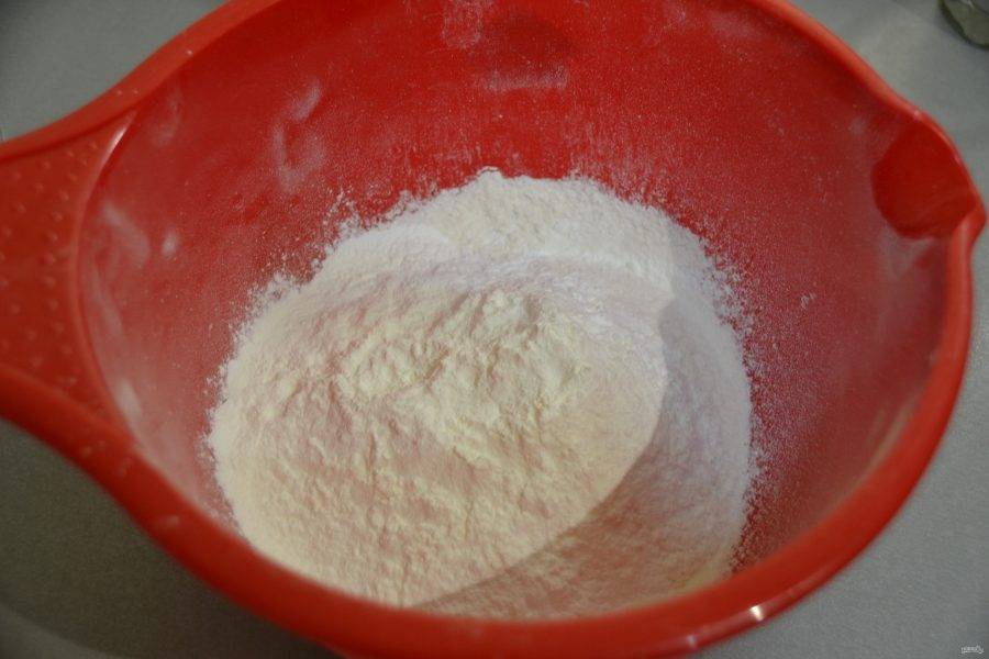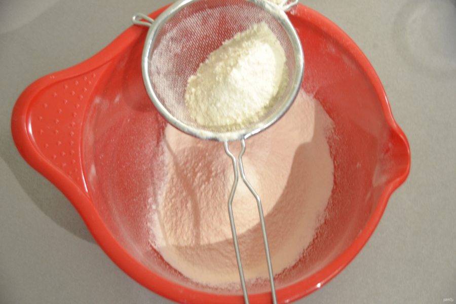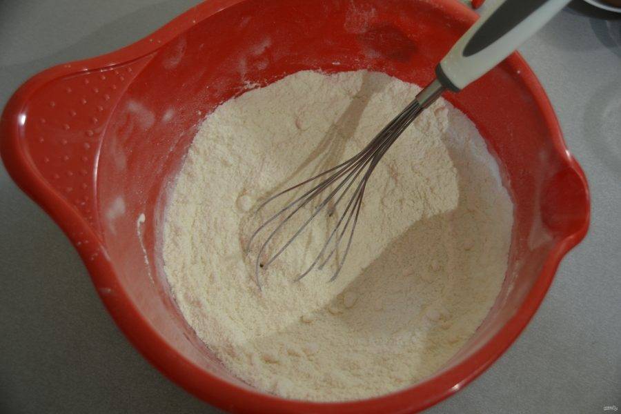 Смешайте все сухие ингредиенты. Для начала просейте муку.